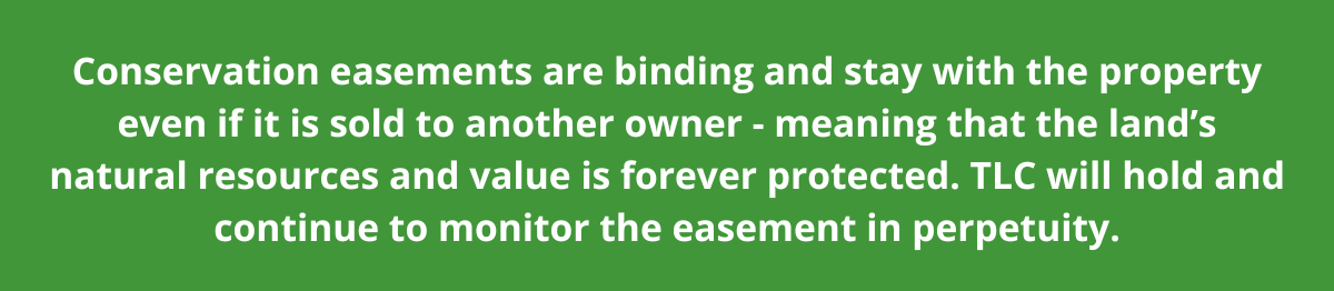 For more information on easements or conserving your land, please see Land Conservation Options and contact one of TLC’s land protection staff members to learn more and understand your options.