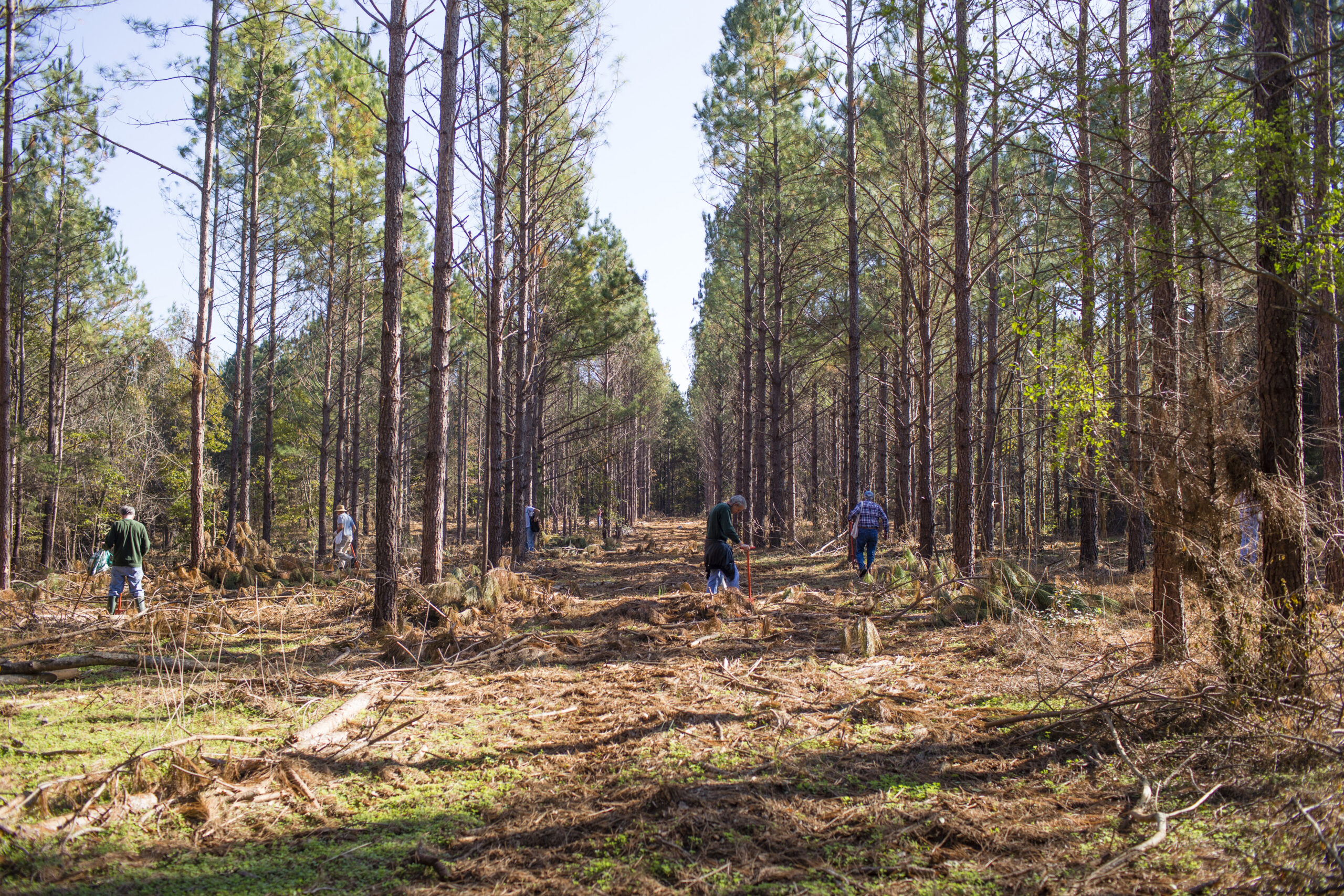 Volunteers planting acorns in a previously thinned stand of machine-planted loblolly pines. You can tell these are plantation pines because they were planted in perfectly straight rows.