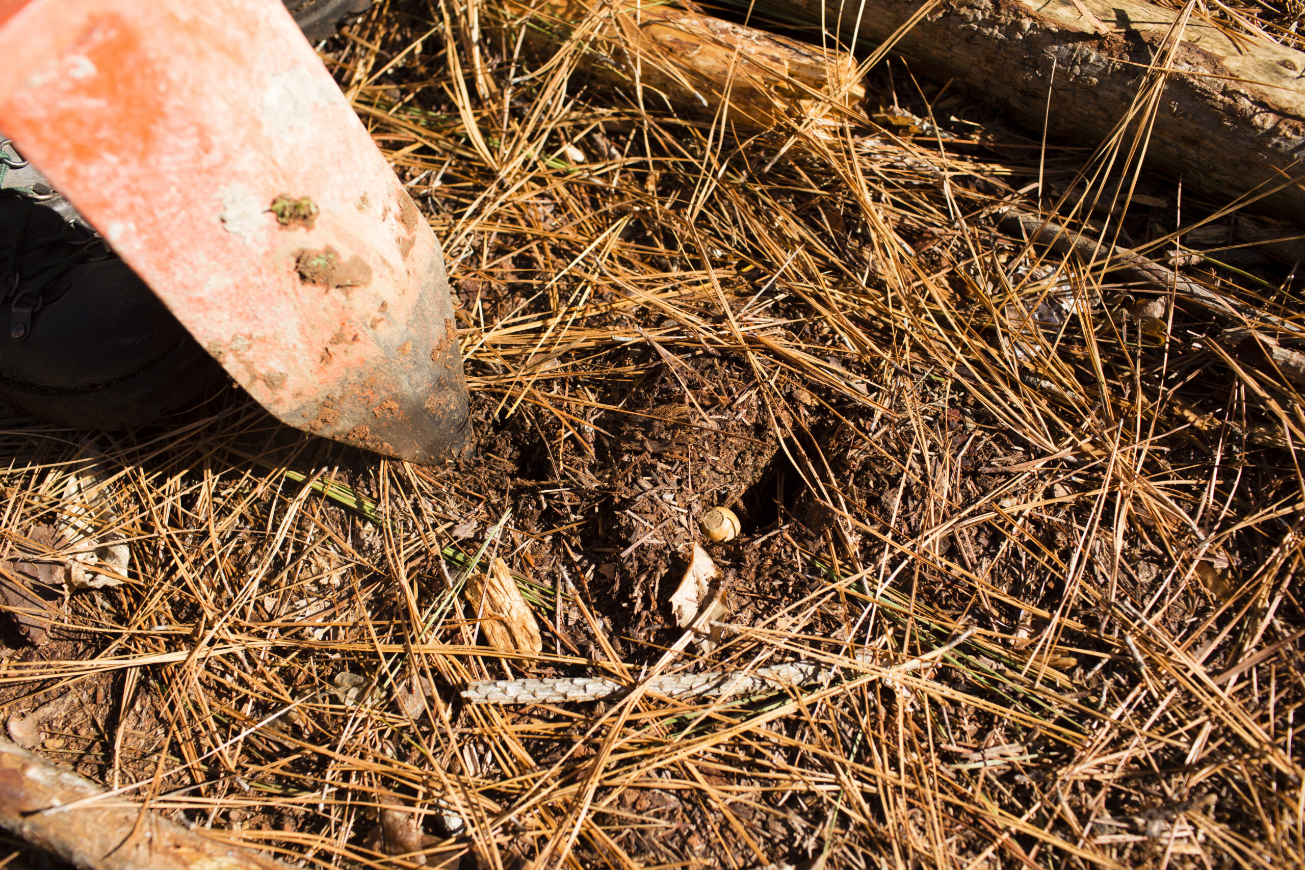 We removed loblolly pine by thinning in several stands, many of which were machine-planted loblolly pine plantations. The purpose of the thinning was to open up the stand to more light in order to benefit additional species, in addition to removing pine trees that would have started to die naturally in the near future. The increased light has made it possible for more species to germinate and grow in the understory. To make use of this additional light and jumpstart the restoration process, TLC volunteers recently planted several thousand acorns and hickory nuts in the thinned pine stands.