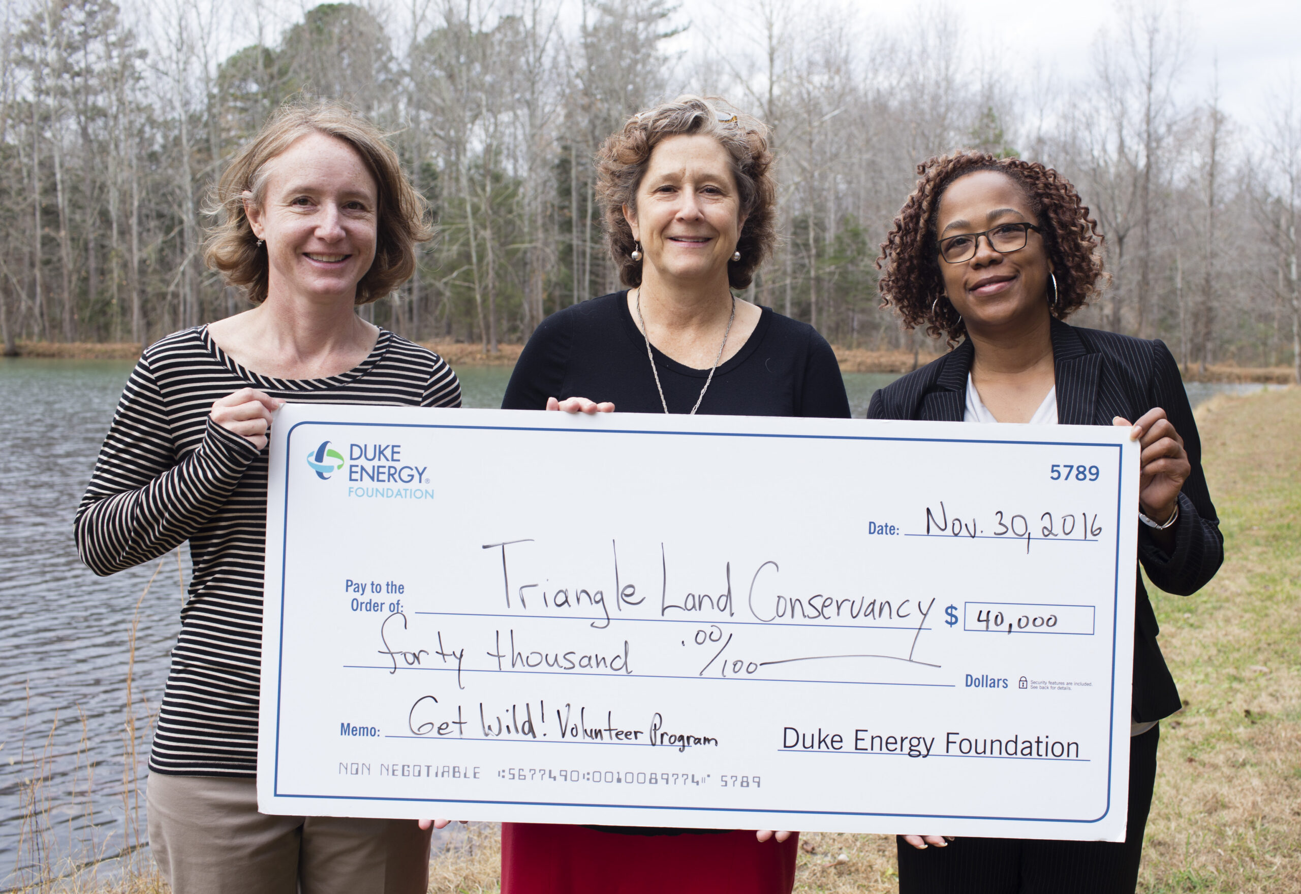 Duke Energy Foundation awards Triangle Land Conservancy $40,000 at check presentation ceremony at Brumley Forest Nature Preserve in Chapel Hill on November 30, 2016. L-R Christine Wilson, Sandy Sweitzer, Indira Everett