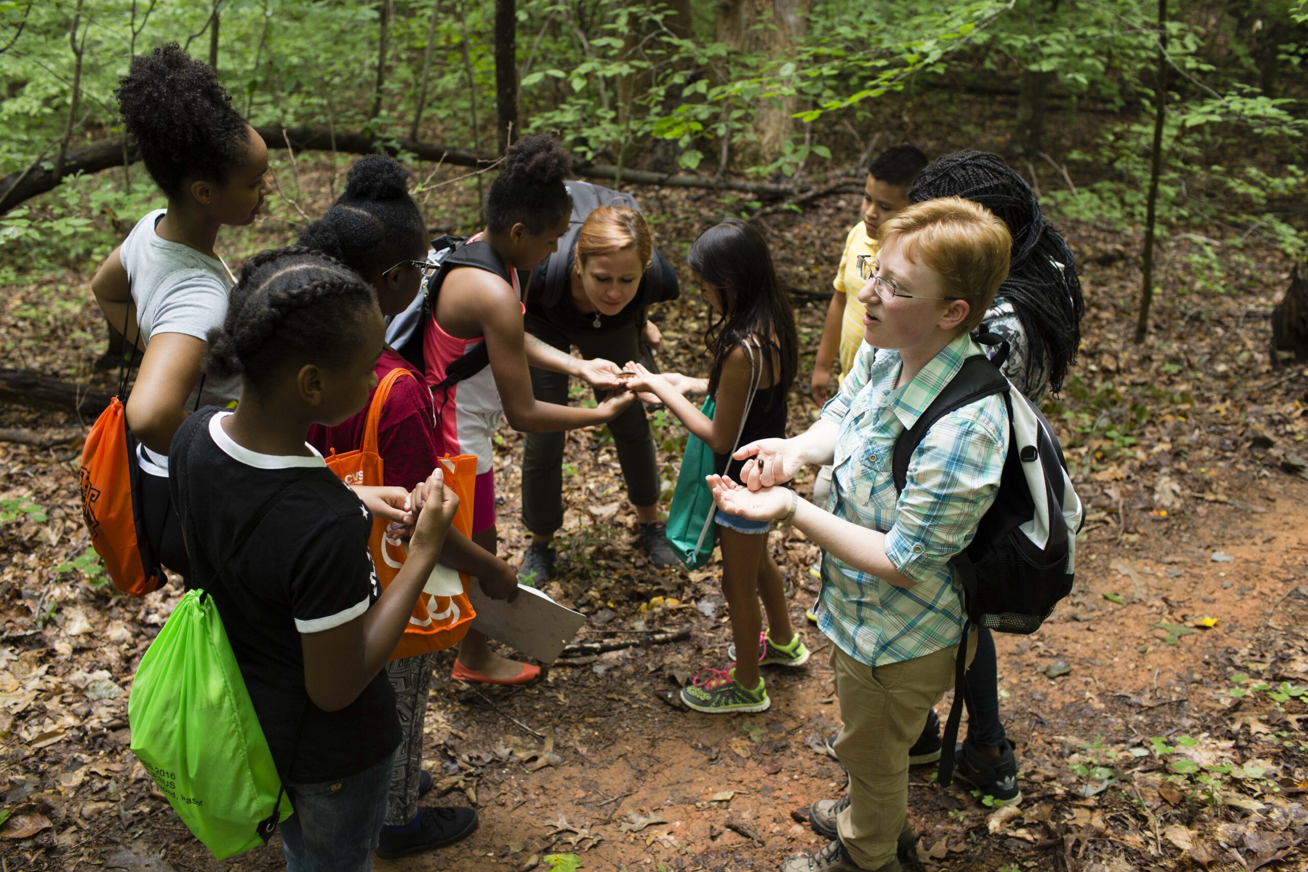 Spotting a large, decaying log just off the trail during our nature walk, I stopped walking and directed the kids to gather around. I asked them why fallen trees are important in a forest, expecting to hear silence or an answer like “they’re good for firewood!” However, the kids interrupted each other in their excitement, telling me how fallen trees provide homes and food for a variety of forest creatures. As we gently rocked the log backwards to look underneath, the kids confidently and comfortably began to make observations about the creatures we found. “Oooh look, an earthworm!” someone shouted, holding up a wriggling worm. Another mused, “I don’t see any of those black beetles; we usually see a lot of those.” Amazed, I asked the group how they already knew so much about these creatures. They told me that they had learned all these things during field trips with the Triangle Land Conservancy’s Americorps members.