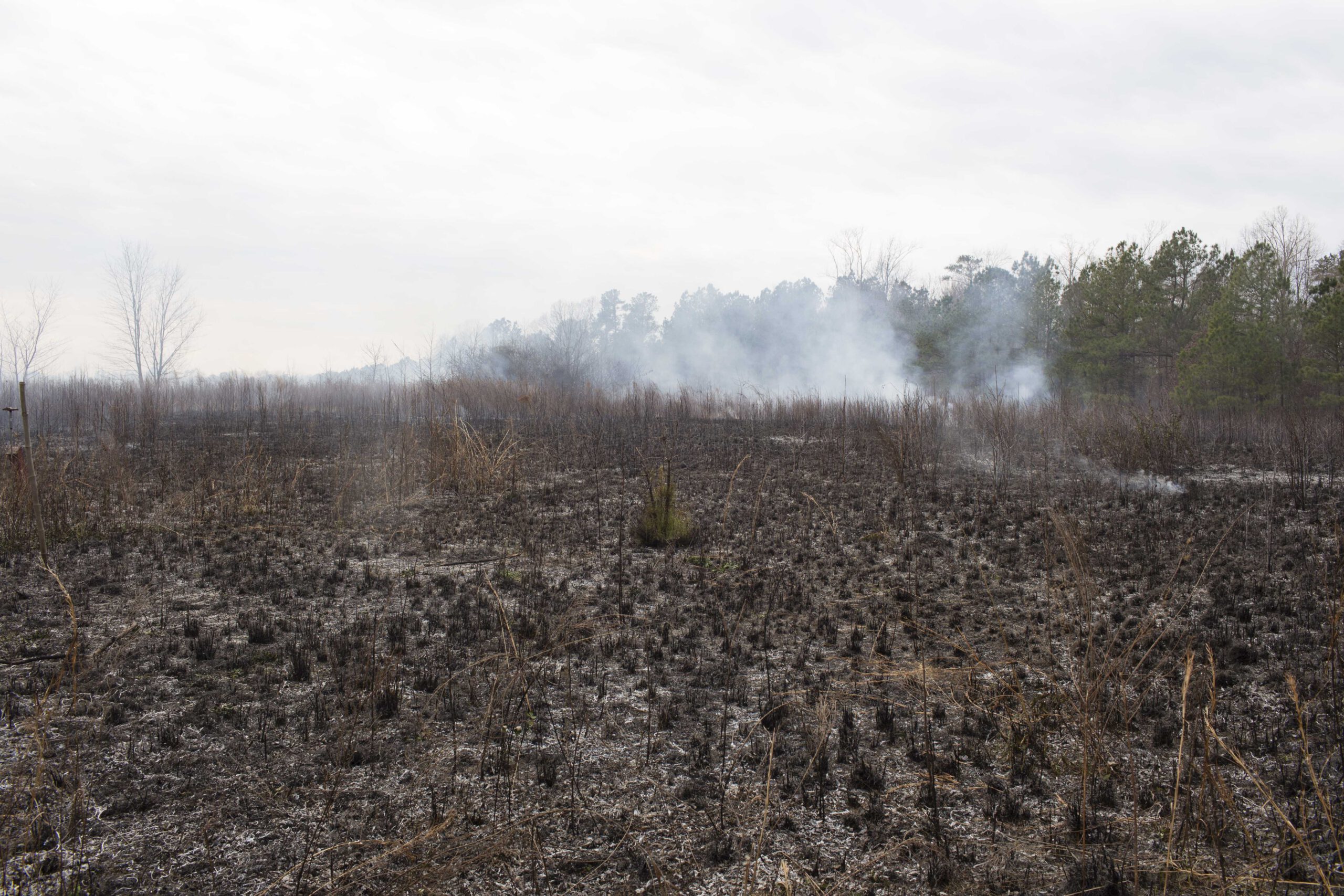 As the burn crew cleans up, making sure the fire is extinguished, the blackened landscape begins to cool. In a few short months the only evidence that this field has been burned will be the charred remains of a few sweet gum and pine seedlings. Through prescribed burning we are establishing meadows full of native plants, improving the health and vigor of forests and reducing the danger of uncontrolled wildfires. The results of our efforts will be evident as clumps of warm season grass and native forbs sprout and grow. The grasshoppers, rabbits, and deer will be back to feed on the new lush growth and the birds will be looking for nesting sites to raise their young. If you’re lucky you will hear the bobwhite calling out its name as it weaves its way between the clumps of grass in search of seeds and insects.