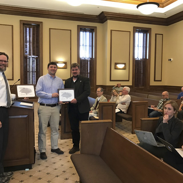 On Monday, March 21, 2017, TLC received several awards at the Chatham County Commissioners meeting from Grand Trees of Chatham. Grand Trees of Chatham is a volunteer organization with the mission to increase public understanding and appreciation of Chatham County's valuable and irreplaceable trees through an awards program and a public education program. TLC received recognition for White Pines Nature Preserve for the Landmark Trees on the property, including two trees that received individual Champion Tree awards, a honey locust and an American hornbeam. While none of the eponymous white pine trees on the property were big enough to receive the Champion Tree designation (they grow them big in the mountains), several other species just missed out. For more information on Grand Trees of Chatham, please visit www.chathamnc.org/government/appointed-boards-and-committees/grand-trees-of-chatham.