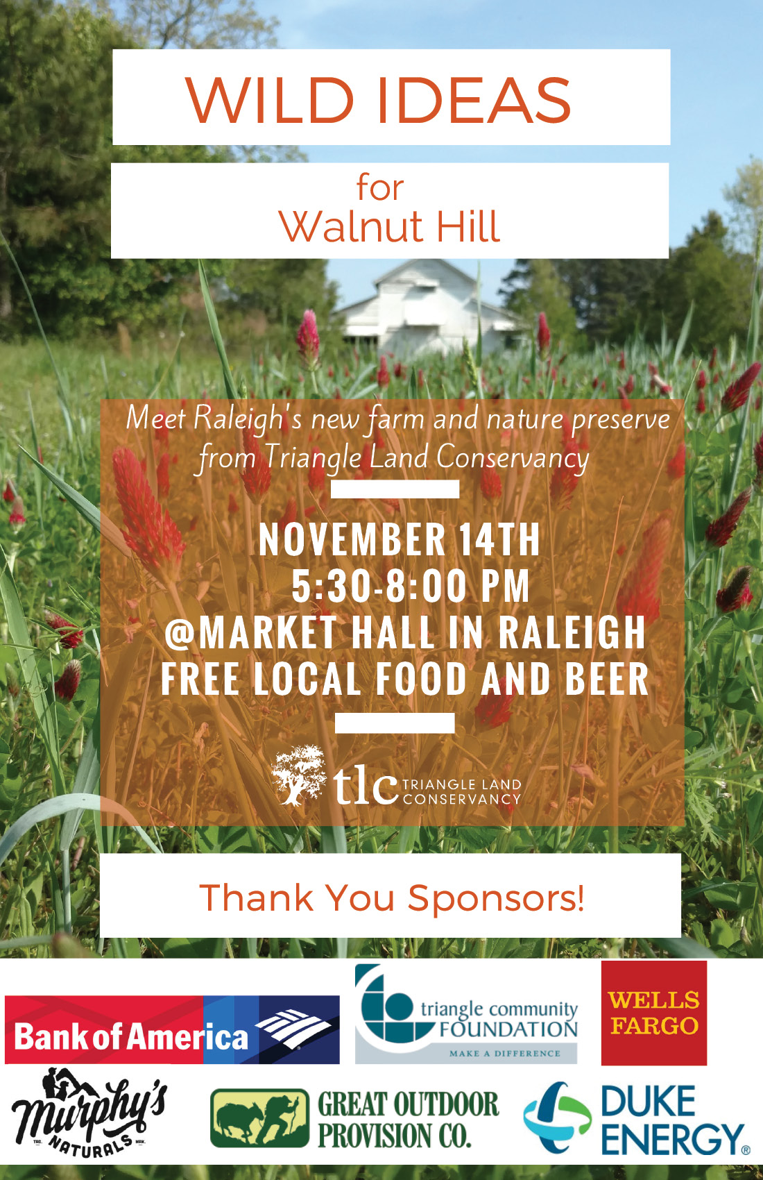Triangle Land Conservancy will host Wild Ideas for Walnut Hill on November 14, 2017 at Market Hall in downtown Raleigh starting at 5:30pm. Community members are invited to learn about TLC’s forthcoming preserve, the Sarah and Bailey Williamson Preserve at Walnut Hill while enjoying free local food and beer. Register online at https://triangleland.org/explore/wild-ideas.