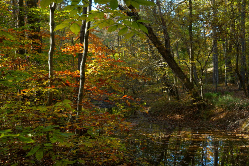 Johnston Mill is a treat throughout the seasons. Fall is a great time to enjoy the changing foliage and keep an eye out for migrating warblers. When the vegetation dies back during the winter you can see the remnants of two gristmills that the Johnston family operated on the creek in the first half of the 1700s. In springtime wildflowers such as trout lily, Jack-in-the-pulpit, and spring beauty carpet the floodplain, and migratory birds fill the trees and the air with their colorful presence and exuberant song. Spring and summer rains rouse a multitude of frogs and toads.